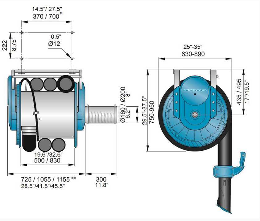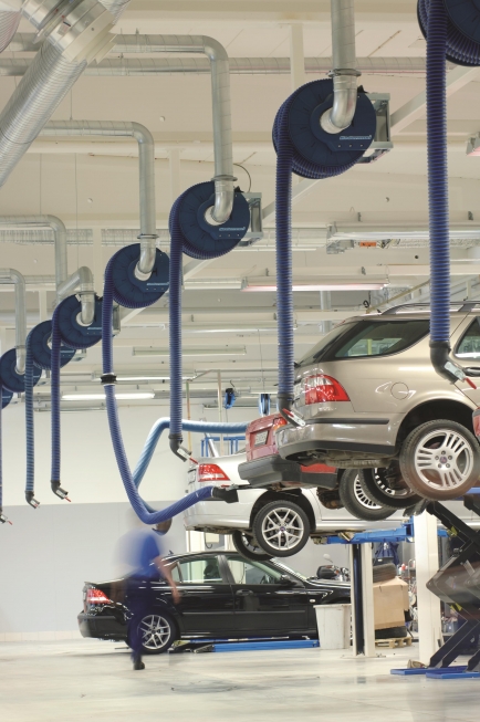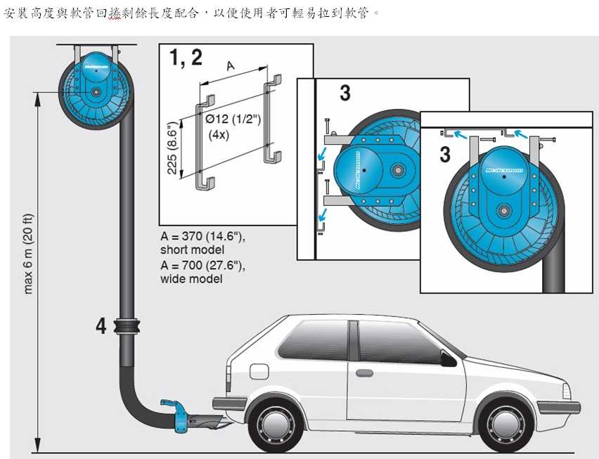 適用於各種類型的車輛作業車間。軟管可以懸掛在夠得著的高度。彈簧裝置使盤管器非常易於使用。盤管器可帶或者不帶自動風門,一個集成的自動風門可節約能源和減少噪音。可選配的軟管回收控制功能可以有效增加設備的安全性和效率。兩個單獨的懸掛支架使盤管器安裝簡單安全。先將支架固定在牆上或者天花板上,再將盤管器安裝在支架上。