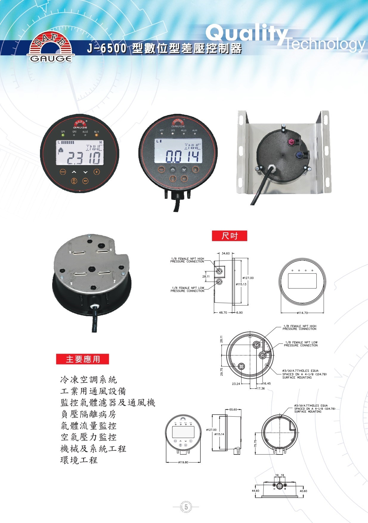 產品說明 ● 9種壓力顯示選擇 ● 4-20MA電流輸出 ● 2組SPDT Relay ● 風速風量量測* (僅單向25inW.C.以下壓差支援) ● 壓力百分比(BAR)顯示 ● 銀幕環保省電功能 ● 直接按鍵輸入設定 ● 權限按鍵鎖定功能